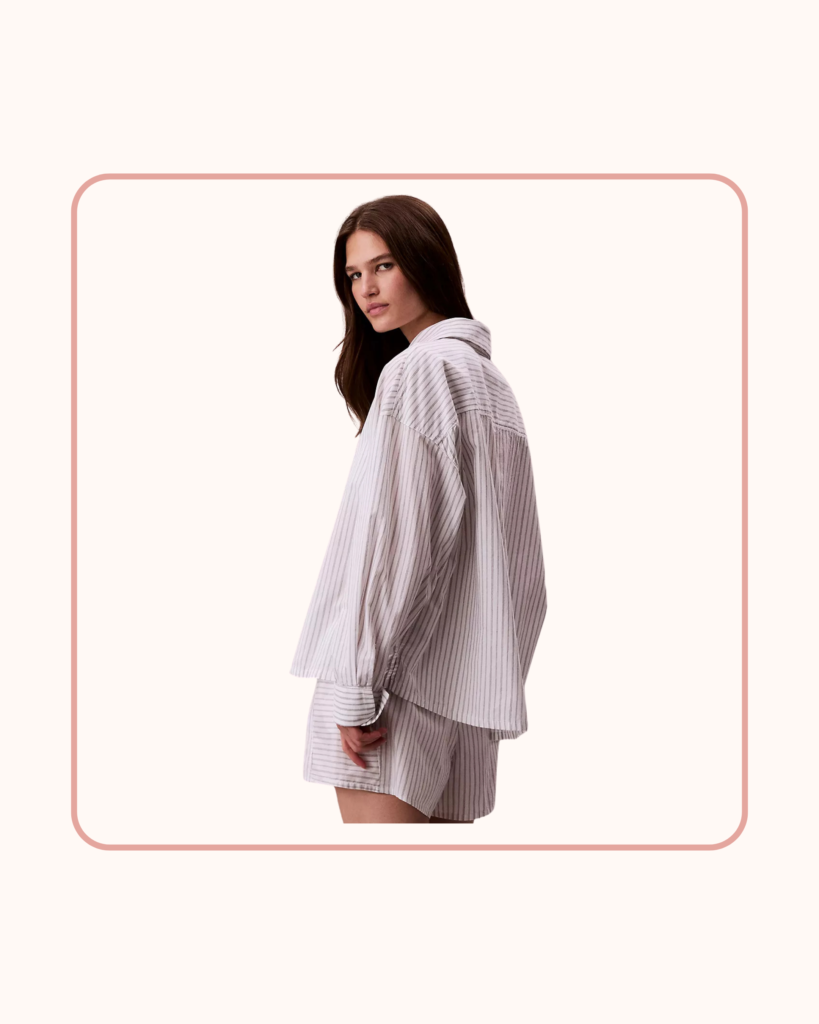 This relaxed cotton poplin sleep shirt borrows its structure from classic menswear, offering a loose, airy fit that works well for travel or overnight stays. If you had an overnight before your 10:00am meeting, pair with high-waisted jeans, and you’re ready to lead the team call.