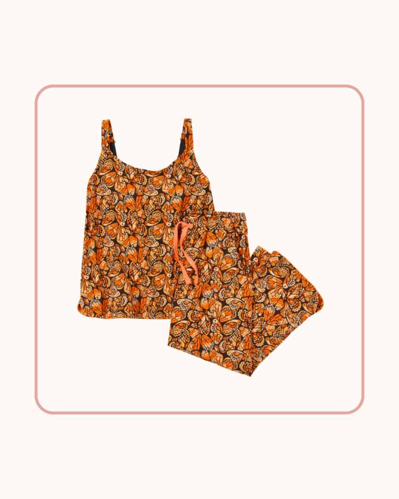 With its easy tank silhouette and cropped capri bottoms, this cotton knit set is ideal for warmer nights or early morning coffee on the patio. The playful print adds personality without sacrificing comfort, while the lightweight cotton knit keeps things breathable for sleepers who tend to run warm.