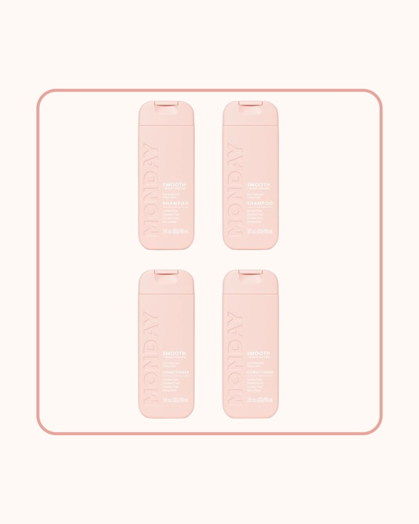 I have textured hair, and for years I relied on Garnier Fructis Sleek & Shine travel packs. That is, until I discovered Monday haircare’s “smooth” line for frizzy hair. My hair has genuinely never looked healthier while traveling.